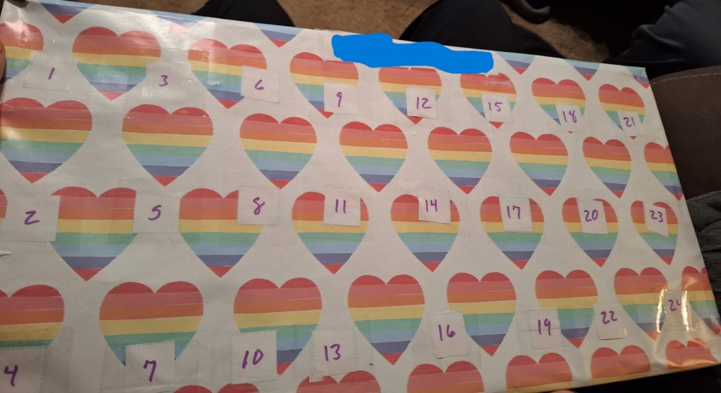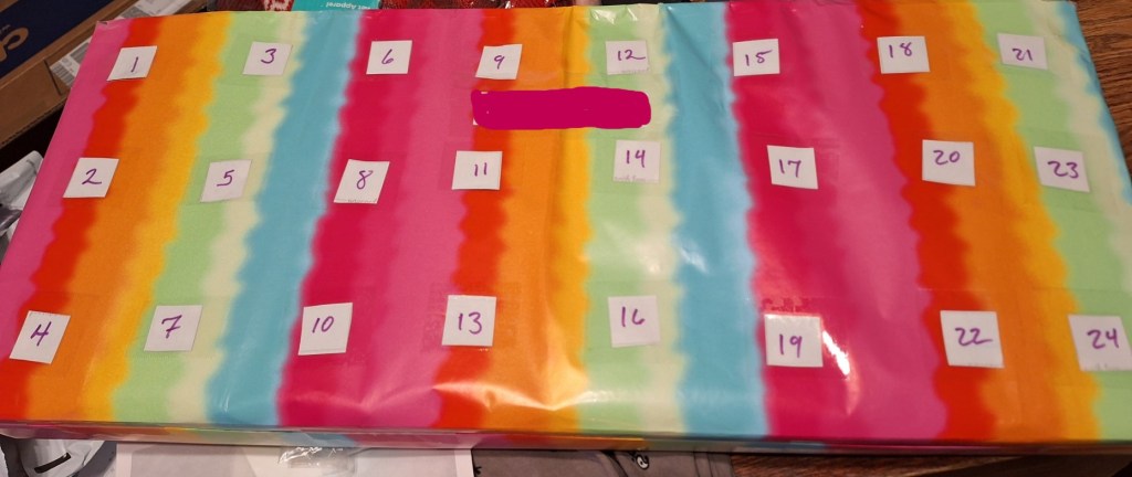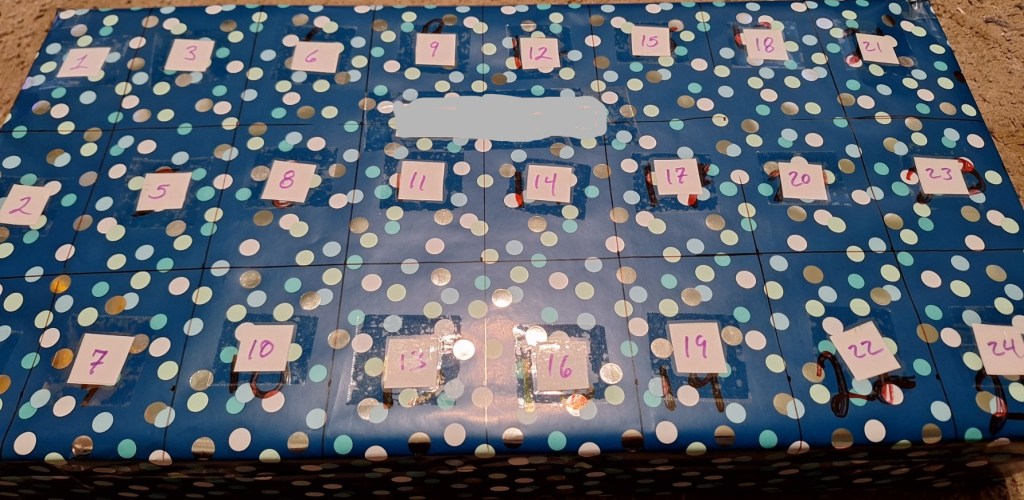 This year my husband made special advent calendars for me and the kids. He hand-made them with cardboard and wrapping paper, and customized them to each of us.