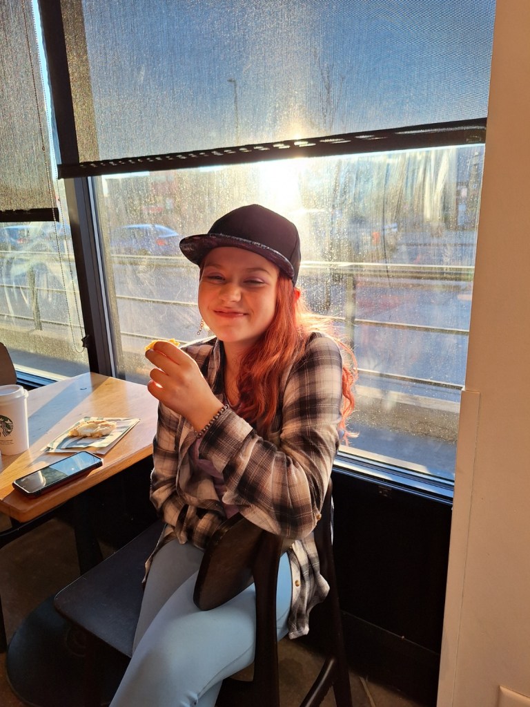 After I picked them up we stopped so I could get some coffee, and my little bit taught me that there are correct light angles for eating a danish. She needed to sit right where she was until she finished it. That’s my girl!
