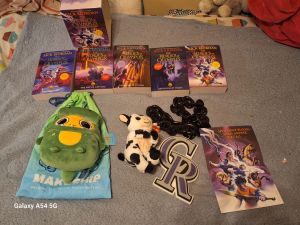 She finished the night off with gifts. Her aunt and cousin brought her a little stuffed cow she got early and used to hold her cards during the game. Her sister got her a plushie that is a dinonugget, and it was a special order we had to place months ago. Her dad and I got her a complete series from Rick Riordan. Lastly, her grandparents got her a bling-type chain for the Colorado Rockies baseball team.