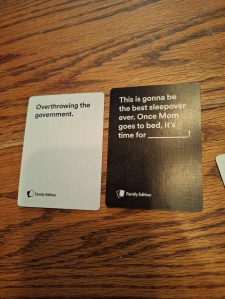 We had her aunt and cousin over and had a game day. We played about three hours of Cards Against Humanity – family edition. There were lots of laughs, and even some tears (happy ones). One of my favorite parts of playing this with her is listening to her tell stories based on the answer cards. She is always so creative.