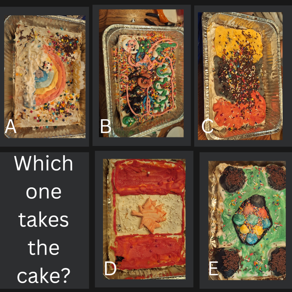 She and her friends decided to have a cake decorating contest. So tonight’s post is actually a poll. Vote for your winner!